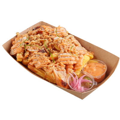 patates kızartması, cheddar sos, bacon, kıtır soğan, turşular ve sos ile servis.
